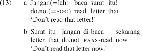 In Malay, as in many other languages, negative commands are formed using a special negative auxiliary verb jangan ‘do not!’ The same softening devices are available as with positive commands (13a, b).