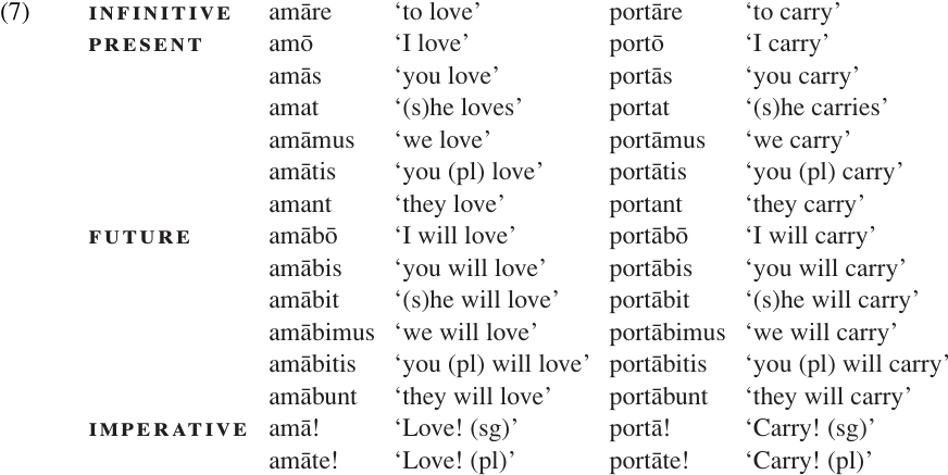 3. Latin does, however, have a distinct “future imperative” form, used when there is an overt adverbial phrase designating a future time, or in “timeless” permanent instructions which are always in force (AllenandGreenough1931). Only the present and future tenses are shown in (7); see Analyzing word structure (24) for examples of past tense forms.