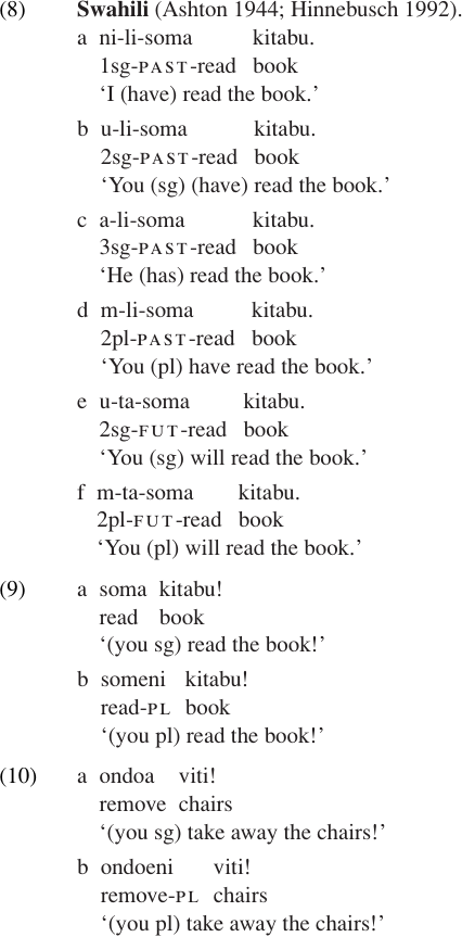 As these examples illustrate, imperative verbs are often morphologically simpler than a corresponding indicative form. In many languages, the imperative form is just a bare root. Even in languages which have a specific affix that marks imperative mood, imperative verbs often lack the normal markers for agreement and/or tense. Swahili provides another striking example. In most contexts, Swahili verbs bear obligatory prefixes which mark subject agreement and tense, as illustrated in (8).4 Imperative verbs, however, do not bear these suffixes. They are not marked for tense or person but only for number: -Ø for singular, -eni for plural. Some examples are given in (9–10).