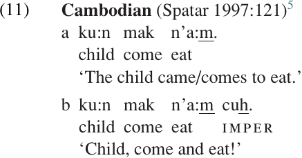 Aside from verbal morphology, another possible way of marking imperative sentences is by using a special particle. This is illustrated in (11) with examples from Cambodian (i.e. Khmer).