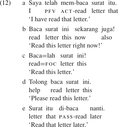 When we give a direct command to someone, we imply that we feel entitled to give such commands, whether this right is based on social status, official position, or personal familiarity. Status and familiarity are always sensitive issues, so most languages have a variety of methods for softening a command or making it sound more polite. In Malay, for example, a simple imperative is expressed using the bare verb stem. For transitive verbs like ‘read,’ this involves dropping the active voice prefix meN-; compare the verb in (12a) with the form used in (12b–e). One way of softening the command is by attaching the focus particle =lah to the imperative verb (12c).6 Other ways of forming a more polite command include inserting the verb tolong, literally ‘help,’ as in (12d); or using the passive form of the verb, as in (12e).