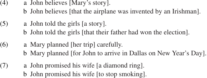 We have dealt primarily with simple clauses whose complements are expressed as NPs or (in the case of oblique arguments) PPs. However, many verbs also allow or require a clausal complement. Examples (4–7) show that, for some verbs, either an NP or a complement clause may occur in the same position. The complement clause may be either FINITE (i.e. tense-bearing), as in (4b) and (5b), or NONFINITE as in (6b) and (7b).