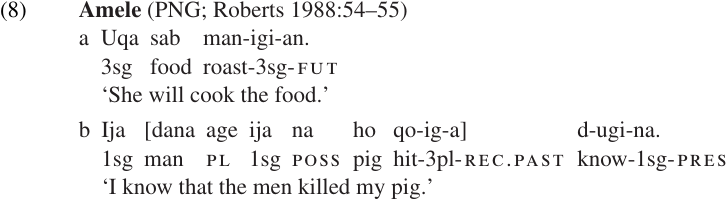 As noted above, complement clauses frequently occupy the same position as NP objects. In languages where direct objects precede the verb, complement clauses often precede the verb as well. For example, the basic word order in Amele is SOV, as illustrated in (8a). Complement clauses in Amele normally precede the verb, as in (8b).