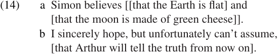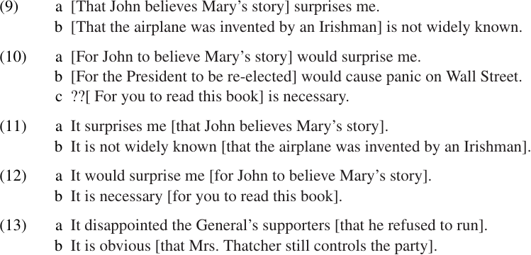 The fact that the complementizer and the clause which it introduces always stay together in the extraposition examples (11–13) suggests that these two elements form a constituent in the Phrase Structure. Further evidence for the existence of such a constituent is provided by examples like those in (14):
