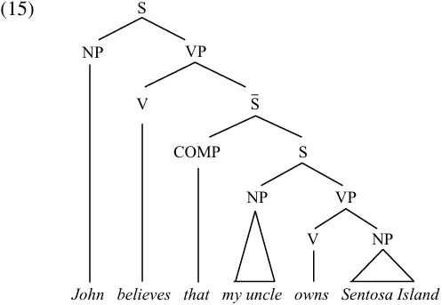 This constituent is normally labeled S՛ or S̄ (pronounced “S-bar”). It contains two daughters: COMP (for “complementizer”) and S (the complement clause itself). This structure is illustrated in the tree diagram in (15), which represents a sentence containing a finite clausal complement.