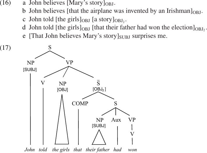 As we noted in (4–7), complement clauses can often occur in the same position as NP complements. This observation suggests that a complement clause may bear the same Grammatical Relation as the NP which it replaces, as indicated in (16). This is a somewhat controversial issue; some linguists have argued that complement clauses must bear a distinct Grammatical Relation.1 But, for the sake of simplicity, we will assume the analysis suggested in (16). An annotated tree diagram based on example (16d) is shown in (17).
