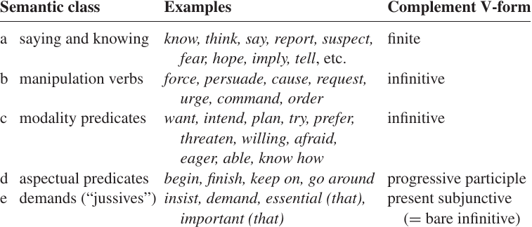 As mentioned in point (d), the form of a complement clause is often determined by the specific verb that occurs in the matrix clause. Verbs that belong to the same general semantic class often take the same type of complement. Some examples of various classes of English predicates follow. Example sentences for each class are given in (18) below.3