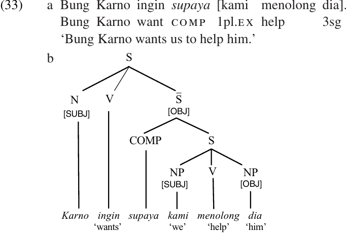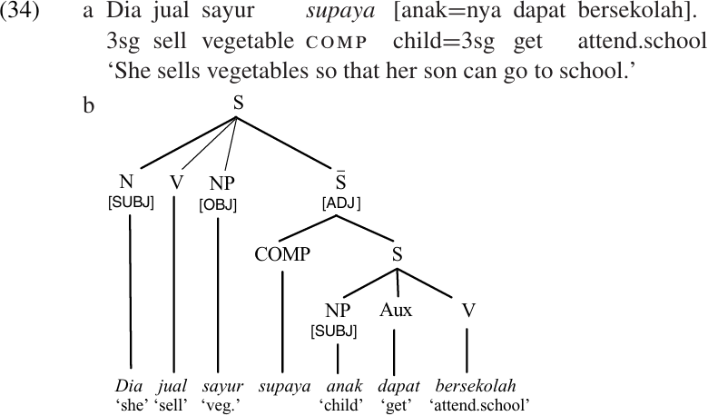 Treating adjunct clauses as PPs provides a more economical description for the sentence structure of English, but this is not true for all languages. In Southern Azerbaijani (Lee1996), for example, the particle ki is used to mark a variety of complement clauses such as ‘Hasan saw that X,’ ‘I hope that X,’ ‘He ordered the servants to X,’ etc. However, the same particle can also be used to mark adjunct clauses of purpose as in ‘He did X in order to Y.’ In Warlpiri the clitic particle =ku is used to mark both complement clauses (for matrix verbs like the coercion and modality predicates listed in Complement clauses) and adjunct clauses expressing purpose. Similarly, the Indonesian word supaya is used not only to introduce complement clauses corresponding to English for . . . to complements, as in (33), but also for certain adjunct purpose clauses as in (34) (examples adapted from Sneddon 1996). In such cases it makes sense to treat these markers as complementizers in both uses, analyzing both the complement and the adjunct clauses as S constituents, as indicated in diagrams (33b) and (34b).