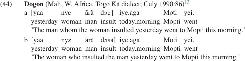 As mentioned above, a few languages have INTERNALLY HEADED relative clauses, in which the head noun appears inside the modifying clause. The examples in (44) are from Dogon, a language of West Africa. Notice that the head noun (‘woman’ in 44a, ‘man’ in 44b) lies inside the modifying clause in both examples. The two sentences are identical, except for the form of the verb in the modifying clause (‘insult’), which indicates whether the head noun is the subject (as in 44b) or a non-subject element (as in 44a).