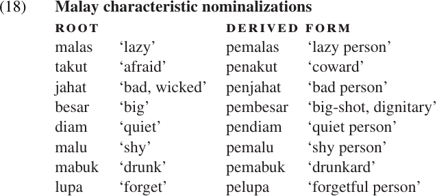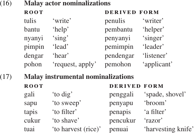 Note that the Malay examples in (16) and (17) use the same prefix, peN-, but with different meanings. (The N- here represents a nasal sound which changes according to its environment, and may also trigger changes in the following consonant. It is not at all uncommon for languages to use the same nominalizer for agentive and instrumental nouns; this pattern is found in Dutch, English, French, Italian, and a number of Malayo-Polynesian languages, to name a few.12