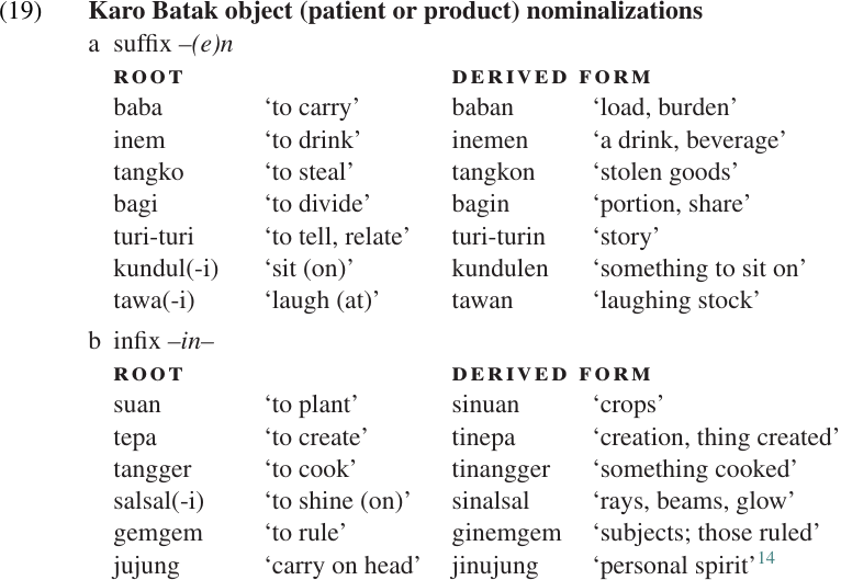 Karo Batak (Malayo-Polynesian, northern Sumatra) has two different ways of deriving “object nominals” from verbs; that is, nominalizations that express the patient or product of the action named by the verb. The most productive of these is formed by adding a suffix-(e)n, as illustrated in (19a). With certain roots, however, an infix–in–is used(19b).13