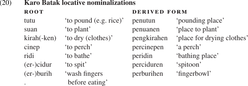 As a final example of deverbal nominalization, example (20) shows how nouns which name the place of an event are derived in Karo Batak. Notice that two different “circumfixes” are used: peN-X-(e)n (mostly with transitive roots) vs. per-X-(e)n (within transitive roots).