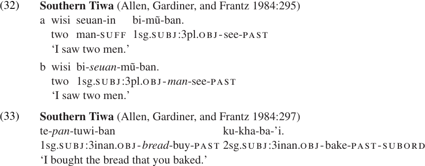 In many languages with valence-preserving incorporation, the in corporated noun can be modified by words or phrases that appear outside the verb: determiners (31c), numerals (32), and even relative clauses (33). These examples provide additional evidence that the verbs in these constructions are still transitive.13