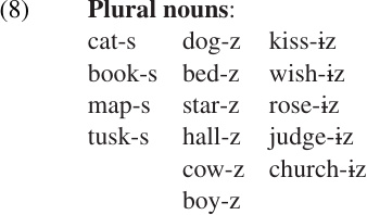 English plural nouns are marked in several different ways, some of which are illustrated in (8). As in (1) and (2), the choice between the variant forms of the plural suffix is phonologically determined. It depends only on the final phoneme of the stem: the form /-ɨz/ occurs after sibilants (grooved fricatives); the voiceless fricative /-s/ occurs after other voiceless consonants; and the voiced fricative /-z/ occurs elsewhere.