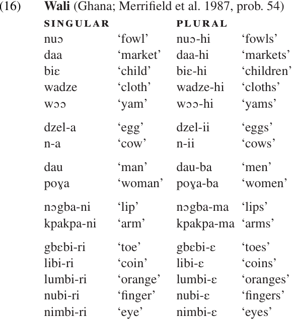 Now consider the data in (16). It is clear that the markers for singular and plural number in Wali have several different allomorphs, and there seems to be no phonological pattern that would allow us to predict which allomorph will occur with which stem. The lexical entry for each common noun must include a feature that shows which form of the number markers that noun requires. These features will divide the set of common nouns into several different sub-classes: [N-class 1], [N-class 2], etc. Since sub-classes of this kind are based on shared patterns of allomorphy involving inflectional affixes, they are often referred to as INFLECTIONAL CLASSEs.