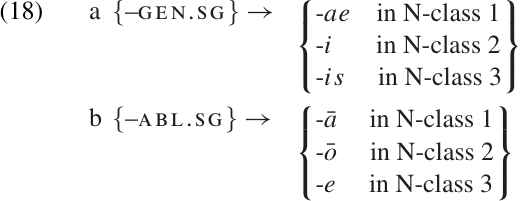 Each of the suffixes in this paradigm (i.e. each case-number marker) would have its own rule of allomorphy, conditioned by the declension class of the noun. Two sample rules are presented in (18).