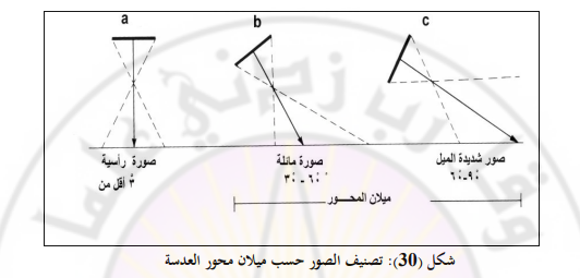 3 ـ الصور الجوية شديدة الميل High oblique photographs : يكون فيها محور العدسة مائلاً بشكل كبير عن المحور الشاقولي ومن ثم فإنها تغطي مساحة أكبر ويمكن الحصول على هذه الصور بوساطة آلة تصوير عادية لذلك فهي اقتصادية وتحتوي على تشوه كبير كلما ابتعدنا عن معلمة الصورة، ومن ثم يكون المقياس مختلفاً بشكل كبير على أجزاء الصورة مما يجعل إمكانية القياس عليها صعبة ومعقدة انظر الشكل (30) والشكل ( 31 a و b ).
