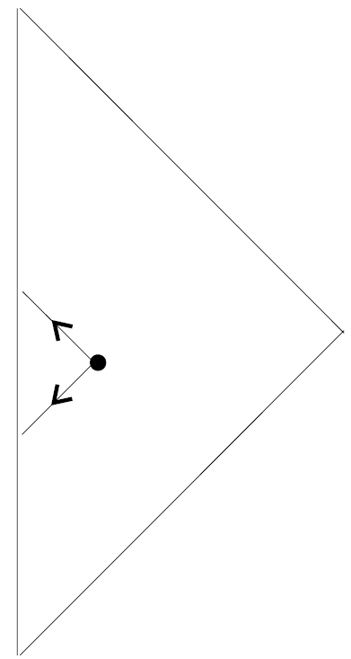 To help visualize how Bousso's construction works we will consider spherically symmetric geometries and use Penrose diagrams to describe them. The Penrose diagram represents the radial and time directions. Each point of such a diagram really stands for a 2-sphere (more generally a (d − 1)-sphere). The four branches at a given point on the Penrose diagram are represented by a pair of 45 degree lines passing through that point. However we are only interested in the branches of negative expansion. For example in Figure 1.1 we illustrate flat space-time and the negative expansion branches of a typical local 2-sphere.I n general as we move around in the Penrose diagram the particular branches which have negative expansion may change. For example if the cosmology initially expands and then collapses, the outgoing future branch will go from positive to negative expansion. Bousso introduced a notation to indicate this. The Penrose diagram is divided into a number of regions depending on which branches have negative expansion. In each region the negative expansion branches are indicated by their directions at a typical point. Thus in Figure 1.2 we draw the Penrose–Bousso (PB) diagram for a positive curvature, matter dominated universe that begins with a bang and ends with a crunch. It consists of four distinct regions. In Region I of Figure 1.2 the expansion of the universe causes both past branches to have negative expansion. Thus we draw light surfaces into the past. These light surfaces terminate on the initial boundary of the