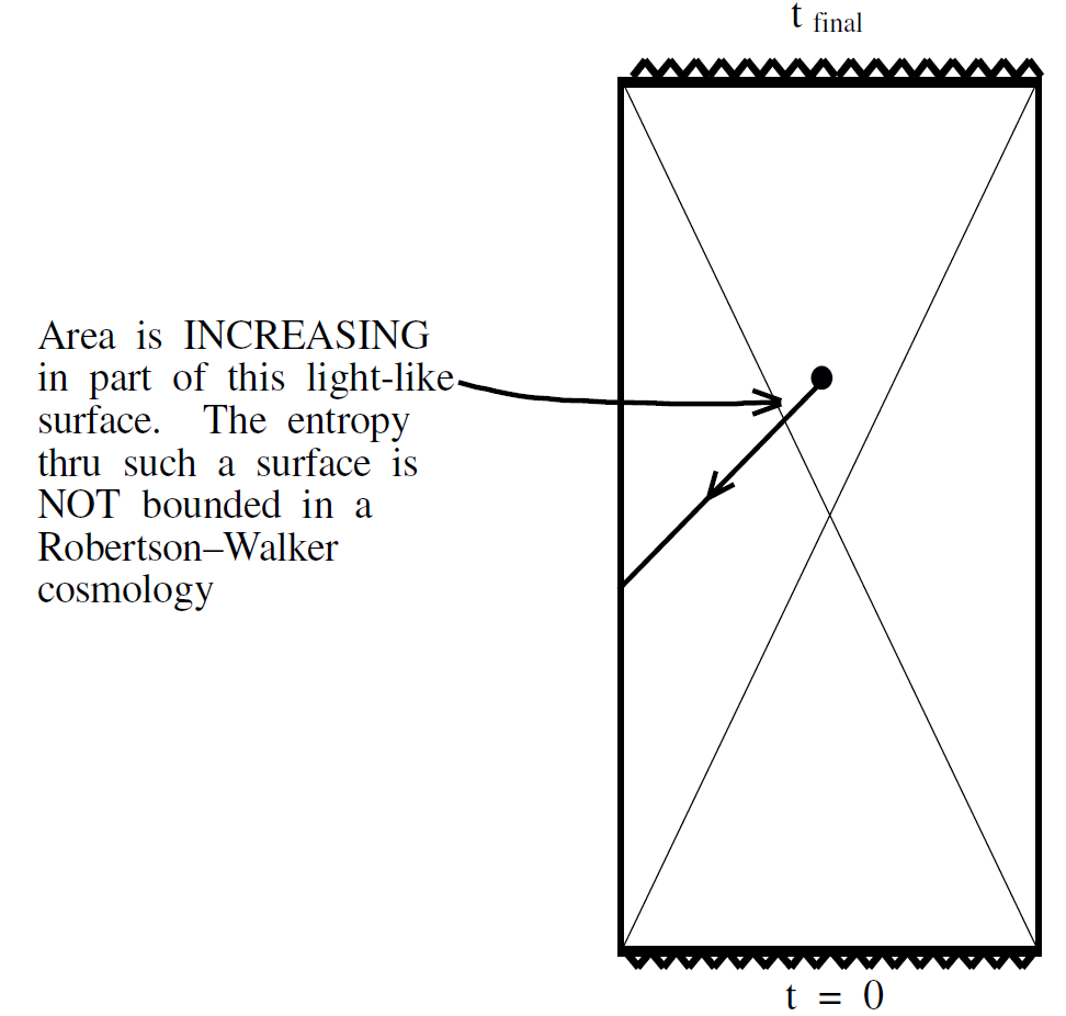Region IV is identical to Region II with the spatial origin being replaced by the diametrically opposed antipode. Thus we see that there are light-like bounds in all four regions but only in II and IV are there holographic bound on space-like regions. (See Figure 1.3.) Figure 1.4 demonstrates a region that does not satisfy an entropy bound for this cosmology.