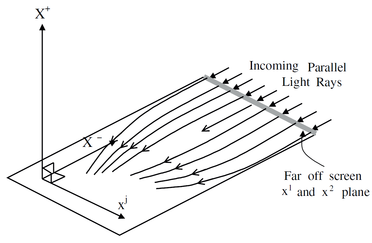 Now consider a space-time point p. We will assign it light cone coordinates as follows. If it lies on the light sheet X+0 we assign it the value X+ = X+0 .Also if it lies on the light ray which asymptotically has transverse coordinate xi0 we assign it xi = xi0. The value of X that we assign will not matter. The two-dimensional xi plane is called the Screen. Next assume a black hole passes through the light sheet X+0 .The stretched