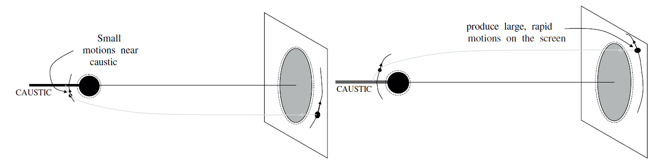 Consider a single point particle external to the black hole undergoing motions near a caustic. Examine the projection of those motion upon the screen, demonstrated in Figures 1.7. One sees that due to gravitational lensing, the image of the particle can move at arbitrarily large speeds!