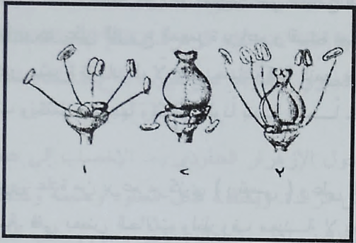 شكل يوضح ازهار الكرمة. 1- زهرة مذكرة الوظيفة. 2- زهرة مؤنثة الوظيفة. 3- زهرة خنثى.
