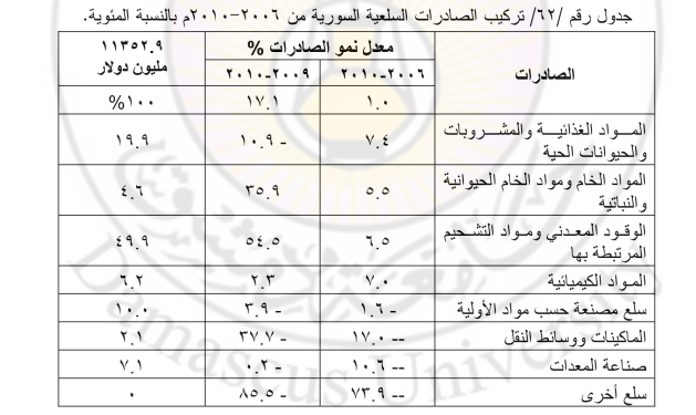 شهدت تجارة السلع المصنعة تحسناً ضمن قائمة الصادرات السورية التي تضم السلع المصنعة مثل صناعة الجلود والخشب والورق والخيوط النسيجية بالإضافة إلى صادرات الألبسة والنسيج وغيرها، وبلغت نسبة إسهامها في الصادرات السورية نحو 10 ، بينما حافظ إسهام القطاع الزراعي على نسبة صادراته والتي بلغت نحو20%، وقد تمثلت في الحيوانات الحية مثل الأغنام والماعز والطيور، ومشتقات الألبان، بالإضافة إلى الخضار والفواكه والمشروبات الغازية والمياه المعبئة، بالإضافة إلى الصادرات السورية الأساسية مثل الفوسفات والقطن وشكلت المستوردات السورية نحو 61% من إجمالي قيمة التجارة الخارجية والبالغ نحو 28914 مليون دولار لعام 2010، وبمعدل نمو سنوي يزيد على 13.7 ، وذلك بسبب زيادة عدد السكان، وارتفاع مستوى معيشتهم نتيجة زيادة متوسط الدخل الفردي.