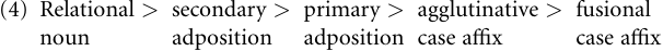 While relational nouns are in fact the major nominal source of adpositions, there may be other nouns as well; for example, the German causal preposition wegen ‘because of’ has the dative plural form of the non-relational noun Wegen ‘ways’ as its source. Note further that once a noun has entered the pathway from noun to adposition, it may (but need not) proceed further to developing into a case marker—as a matter of fact, in the vast majority of instances it does not; the grammaticalization process can be arrested at any stage in its development.