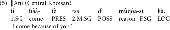 In addition to body-part and landmark nouns there is a wide range of other nouns serving as sources for adpositions, acquiring adpositional functions other than locative and temporal ones, as can be seen in English prepositions such as instead of, in spite of, by means of, on behalf of, etc. One common group of nouns, expressing meanings such as ‘matter’, ‘ground’, ‘cause’, tends to give rise to cause or reason adpositions. An example is provided by the noun mùqo̒a̒-sı̀ ‘matter’ (matter-F.SG) of the Khoisan language ǀǀAni of Botswana, which developed into a cause postposition: