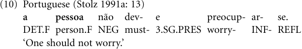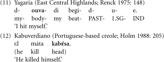 Finally, mention should be made that nouns meaning ‘body’, ‘head’, etc. have given rise to reflexive pronouns; there are hundreds of languages that have been documented to have undergone this grammaticalization process (Schladt 2000; Heine 2000, 2005). As a rule, this process involves noun phrases consisting of a body or body-part noun plus a possessive modifier, as in example (11) from the Papuan language Yagaria of New Guinea; but there are also cases where the noun on its own turns into a reflexive marker, or where the possessive modifier is lost. Accordingly, there are a number of languages where the reflexive pronoun consists of the bare noun, as in (12):