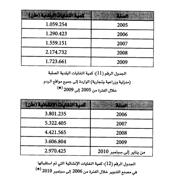 وتصنف منظمة الصحة العالمية (WHO) مجتمعات دول مجلس التعاون الخليجي ضمن المجتمعات المتحضرة التي تتميز بارتفاع في معدلات تولد النفايات مقارنة بمعدلات إنتاج الفرد من النفايات في بعض البلدان العربية الأخرى، وبالطبع يرجع ذلك لارتفاع مستوى دخل الفرد في دول مجلس التعاون الخليجي عنه في بقية الدول العربية وتدل آخر الإحصائيات الصادرة عن إدارة شؤون البيئة ببلدية الكويت في هذا الشأن العام 2010 إلى أن النفايات السكانية الصلبة الواردة إلى مواقع الردم بلغت 1.723.661 طنا، كما بلغت المخلفات الإنشائية الواردة إلى مواقع الردم .3.606.804 أطنان عن العام 2009. كما لوحظ أن كمية الأوراق والكرتون قد وصلت أيضا في العام 2005 إلى 72 ألف طن. وعدم تدوير النفايات بصفة عامة في دولة الكويت يسبب خسائر اقتصادية كبيرة كما يستهلك مساحة تقدر بحوالي 600 متر مربع يوميا تهدر نتيجة لدفن النفايات المختلفة. وهذا الهدر يسبب مشكلة لدولة الكويت ذات المساحة الصغيرة (17.818) كلم2، كما أن عمليات تحلل النفايات داخل مواقع الردم تنتج عنها كميات كبيرة من الغازات الضارة بالبيئة والمسببة لتلوث الهواء الجوي مثل غازات الميثان وثاني أكسيد الكربون والهيدروجين وكبريتيد الهيدروجين، والروائح الكريهة الناتجة عن هذه الغازات. ويتبين من الجدولين (11) و (12) كميات النفايات البلدية الصلبة، وكذلك النفايات الإنشائية.