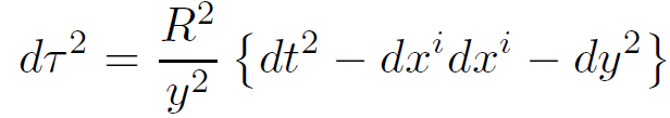 The second way that equations 1.1 and 1.2 are related is that 1.2 is the exact metric of an incomplete patch of AdS space. A time-like geodesic can get to y = ∞ in a finite proper time so that the space in equation 1.2 is not geodesically complete. It has a horizon at y = ∞. When interpreted in this manner, time coordinates appearing in 1.1 and 1.2 are not the same.