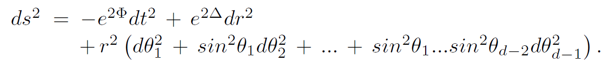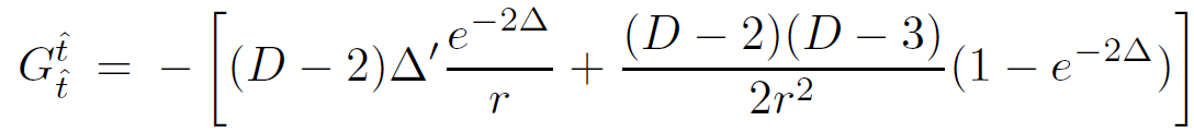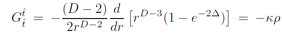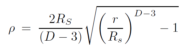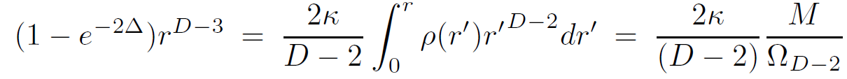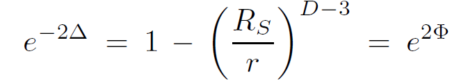 For pressureless matter in the exterior region (ρ = 0 = P), we can immediately conclude that Φ = −Δ. Defining the Schwarzschild radius RD−3S = 2κM/(D−2)ΩD−2 we obtain the form of the metric