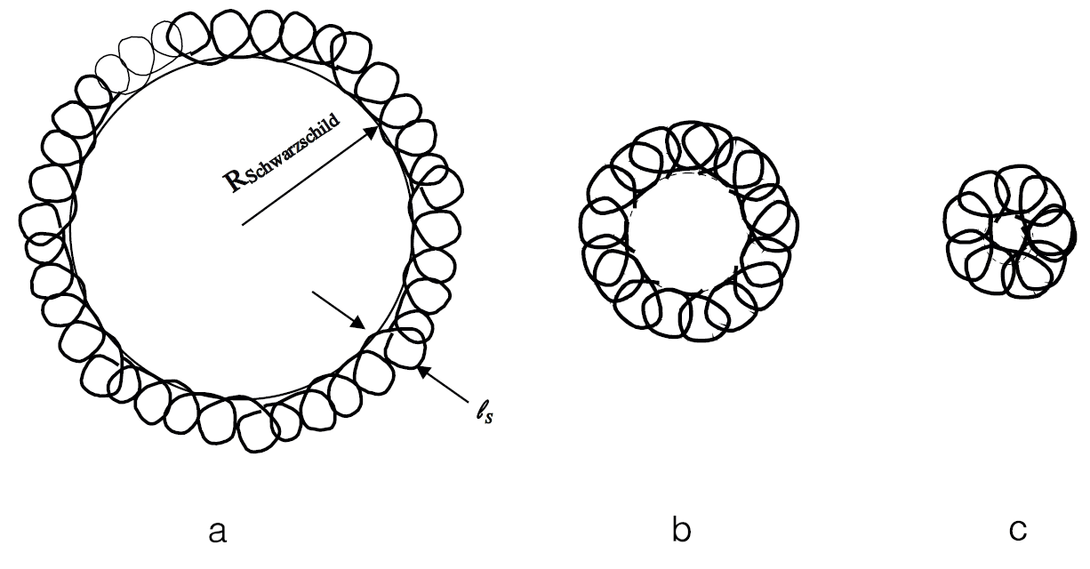 Fig. 1.1. Evolution from black hole to string. (a) A black hole with stringy stretched horizon smaller than Schwarzschild radius, (b) with stretched horizon and string scale comparable to radius scale, and (c) turned into a string.