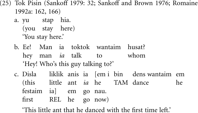 An example of this pathway is provided by the English-based Tok Pisin and other varieties of Melanesian PE, where the English adverb here was grammaticalized to a demonstrative and a relative clause marker ia (or ya). Since its origins around 1880, strategies of relativization have been gradually arising in Tok Pisin. According to Romaine (1992a: 146, 170), zero-marked relative clauses may have been the original strategy in Tok Pisin, and relative clauses are comparatively recent developments in the history of the language, and this applies especially to ‘‘bracketing relative clauses’’ (Romaine 1992a: 166–7). SankoV and Brown (1976) discuss how the new relativizer ia developed from a demonstrative or generalized deictic particle in discourse. The following examples illustrate the various stages in this development, where (25a) shows the use as a place adverbial, (25b) as a postposed deictic or demonstrative, and (25c) as a double-bracketed relativizer.