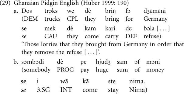 The development of new modes of clause subordination is virtually predictable in the later development of pidgins. The following is an example from Ghanaian Pidgin English of West Africa, illustrating the process from a speech act verb ‘say’ to a complementizer. The following sentence can be interpreted in the same way as a direct-speech utterance, where the erst while verb se ‘say’ functions as a quotative marker (28a), or as a [main clause–complement clause] structure, where se has the function of a complementizer2 after the perception verb si ‘see’ (28b).3