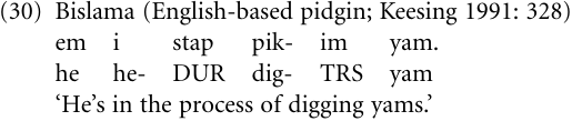 More examples of grammaticalization can be found in other English-based extended pidgins. In Bislama, a pidgin of Vanuatu, speakers used an expression commonly recruited crosslinguistically to develop progressive and durative aspect markers (Heine and Kuteva 2002a: 127, 198), namely the verb stap ‘stay, be present, exist’, historically derived from English stop, to develop a durative aspect marker:4