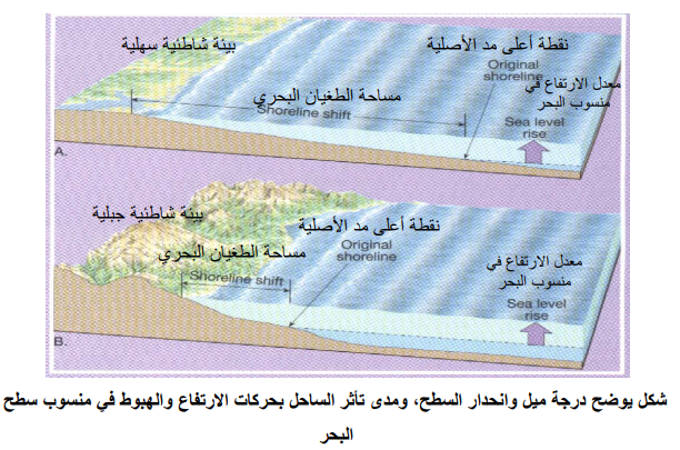 تختلف المناطق الساحلية من حيث درجة انحدارها اعتمادا على التضاريس الأرضية سواء كانت ضمن مناطق جبلية أو مناطق سهلية عند دراسة البيئات الساحلية المختلفة نرى أنه توجد سواحل واسعة سهلية قليلة الانحدار وأخرى سواحل ضيقة وغيرها من الأجراف الساحلية. تعاني دول كثيرة في العالم من تقهقر المساحة الساحلية أو الأرضية بمعنى آخر وزيادة مساحة البحار خاصة إذا كانت سواحلها شديدة الانحدار تحتوي على أجراف صخرية من صخور قليلة التماسك والصلابة وهذه المناطق تكون معرضة لانهيارات صخرية وانزلاقات أرضية وتلف للمنشآت والأراضي الزراعية الساحلية مثال على ذلك ما يحصل في السواحل الشرقية من بريطانيا المواجهة لبحر الشمال الفاصل بينها وبين أوروبا حيث تكون الأمواج عالية السرعة معظم الأحيان وطبيعة السواحل من نوع الأجراف الصخرية مما أدى إلى تآكل وتراجع المنطقة الساحلية إلى الخلف باتجاه اليابسة وهذه الحالة أدت إلى حدوث مشاكل كثيرة في البيئة خاصة ضمن المناطق المأهولة في السكان وضمن المناطق الزراعية في أعالي الأجراف وبيئات الطيور المختلفة والكائنات الحية التي تسكن هذه الصخور والشواطئ.