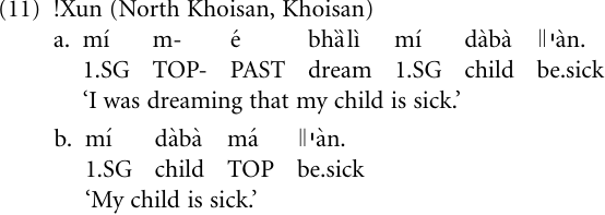 In languages lacking formal means of marking nouns, expansion can simply mean that a complement noun phrase is replaced by a clause, and in such cases it remains unclear whether there is in fact clause expansion, or else integration (5.3). For example, in the Khoisan language !Xun, one way of forming complement clauses after cognition verbs is by simply using a clause instead of a complement noun phrase. Thus, in example (11a), mı̒ dàbà ǀǀˡàn ‘my child is sick’ has the form of a main clause. That it is a subordinate clause can be seen in the fact that it lacks the topic marker ma̒, which is an obligatory part of the main clause, as in (11b).