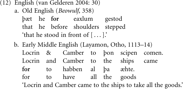 Adverbial clauses Expansion from noun to finite clause is particularly common in the rise of adverbial clauses, to which we now turn (see also “Treating events like objects”). An incipient stage in the development where an adposition or case marker is used via the extension mechanism to also mark adverbial clauses is provided by the following English example volunteered by Hopper and Traugott (2003: 184–5). They observe that, fairly recently, the prepositional phrases on the basis (of) and in terms of have come to be used to link clauses together, for example, They’re a general nuisance in terms of they harass people trying to enjoy the park. A fully grammaticalized English example—which we briefly touched upon earlier—can be seen in the development of for, which was a preposition of location and purpose in Old English, cf. (12a), but came to be used as a purpose clause subordinator (and a complementizer) by early Middle English, cf. (12b) (van Gelderen 2004: 30).