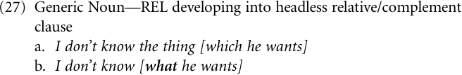 One major source for complementizers consists of some generic noun (N) having argument status in the main clause and at the same time forming the head noun of a relative clause. The grammaticalization process involved changes structure (27a) into one like (27b), whereby the noun (N) plus the relative clause marker (REL) jointly give rise to a complementizer and the relative clause turns into a complement, or free relative1 clause (the English examples are meant to illustrate the nature of the process concerned).