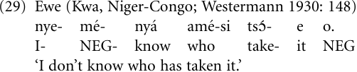 The Ewe language illustrates the use of merger (29): ame̒-si (person-REL) ‘who(m)’, nu̒-si (thing-REL) ‘what’, afı̒-si (place-REL) ‘where’, Ɣe-si-Ɣi (time-REL) ‘when’, for example: