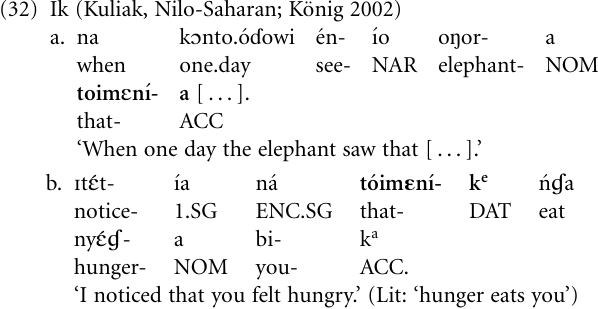 (d) As a result of the process from noun to complementizer, nominal properties are extended to also become properties of subordinate clauses. For example, case inflections are crosslinguistically a characteristic of nouns (in some languages also of noun phrases), but in Ik they have become part of clause subordination as well (see König 2002 for details).