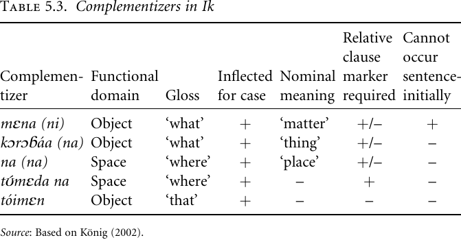 (e) Clause subordinators in a given language are frequently not a homogeneous class, some are more strongly grammaticalized, others less so. Thus, Table 5.3 suggests that the Ik complementizers can be arranged along a cline of grammaticalization: At one end there is mεna, which largely still behaves like a noun, and many of its uses can be interpreted with reference to its nominal meaning. At the other end there is to̒imεn, which has lost most of its associations with nouns, having no function other than introducing complement clauses.