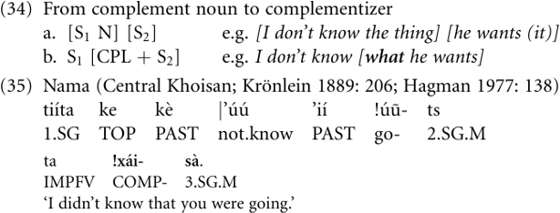 As a result of decategorialization and erosion, complementizers tend to become increasingly dissimilar from their lexical sources, losing both nominal properties and phonetic substance. The following example (33) from the !Xun language of southwestern Africa illustrates the grammaticalized output of the process: The complementizer tce̒ is the compressed version of a noun phrase, consisting diachronically of the noun tcı̒ ‘thing’ and the relative clause marker-è, hence tcı̒-è > tce̒. Thus, (33) means historically ‘I don’t know the thing that he wants’.