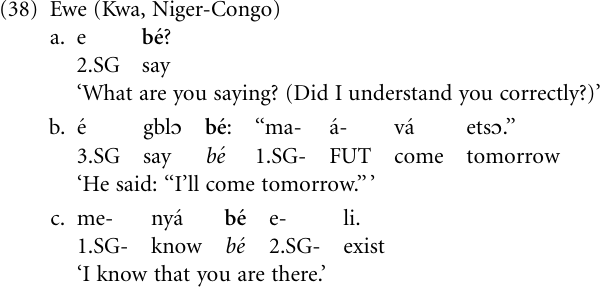 The following examples from Ewe illustrate the process. Sentence (38a) shows the lexical use as a speech act verb, nowadays highly restricted in the contexts in which it can occur, while (38b) shows the quotative use preceding direct-speech sentences and (38c) the object complementizer use after a cognition verb.
