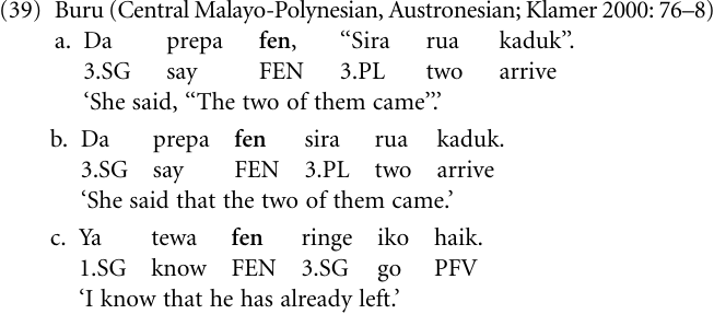 Similarly, the Austronesian language Buru of Indonesia illustrates this grammaticalization channel (Klamer 2000: 75 V.). The item fen(e) is used as a lexical verb meaning ‘think, say, affirm’, it also occurs as a quotative marker (39a), and as a complementizer after speech act verbs (39b) and mental and physical perception verbs (39c). After speech act verbs, the use of fen(e) is optional. There is no evidence that fen(e) has reached the stage of marking subject complement clauses.