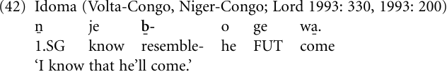 While presumably less common than speech act verbs, similative verbs meaning (‘be like’, ‘be equal’, ‘resemble’) also provide a source for complementizers (Güldemann 2001). The exact nature of this evolution is not entirely clear; from the data available it seems that the process typically leads from the similative via quotative to complementizer uses. The following are a few examples of this grammaticalization. In the Nigerian language Idoma, the verb bε̄ ‘resemble’ has given rise to a complementizer after verbs of thinking, seeing, knowing, and hearing, cf. (42). Similarly, in the Ghanaian language Twi, there is a verb sε ‘resemble’, ‘be like’, ‘be equal’, that appears to have provided the source for the complementizer sε (Lord 1993: 160).
