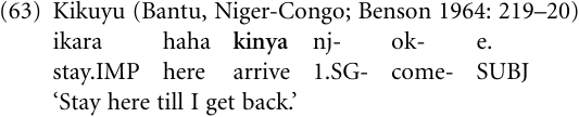 Lexical verbs may also develop into temporal clause subordinators. For example, in the Kenyan language Kikuyu, the intransitive verb-kinya ‘arrive at, come’ has given rise to a temporal conjunction kinya ‘until’, for example: