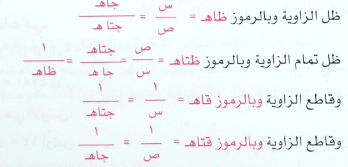 ومن هذا وذلك تنتج بقية النسب المثلثية والتي تسمى هنا بالاقترانات الدائرية من العلاقات التالية :